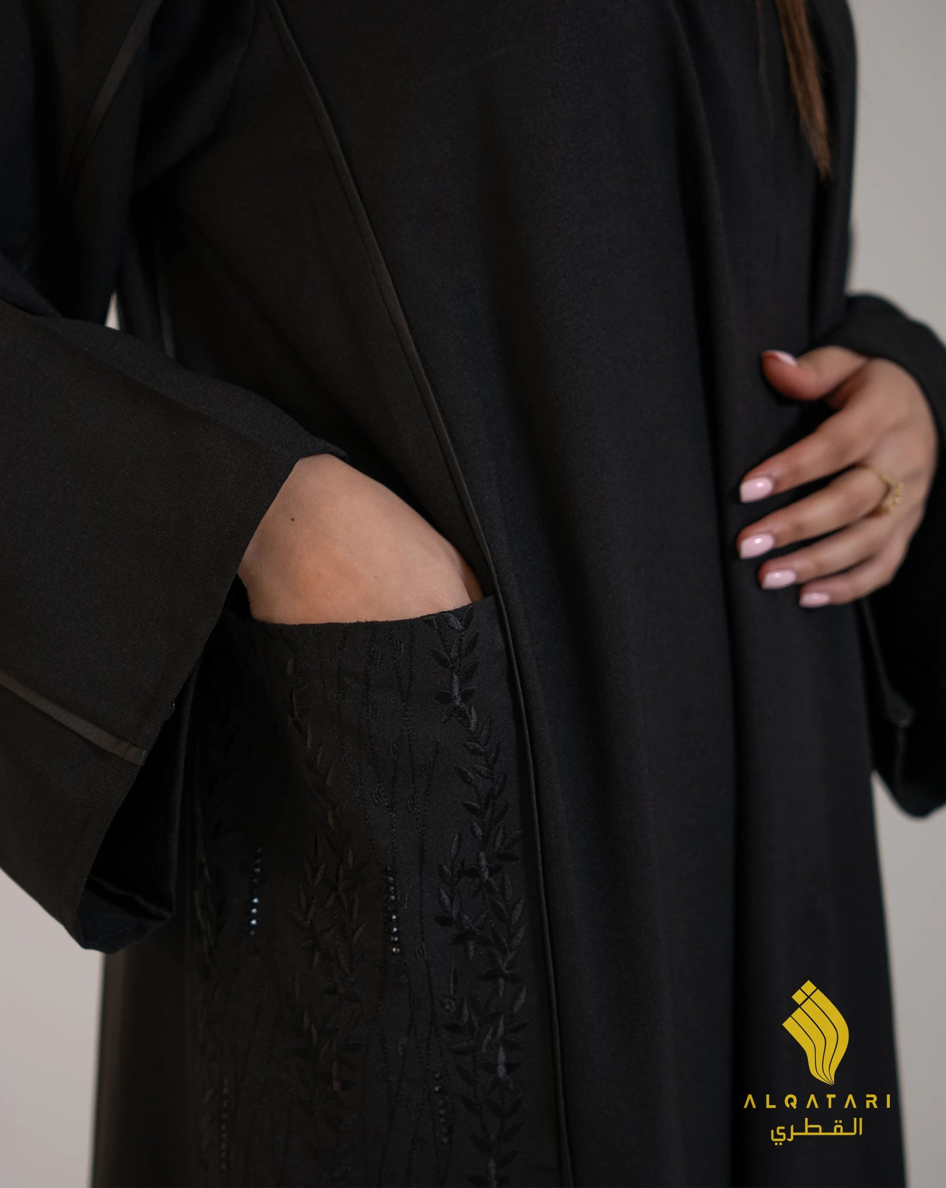 A sophisticated black abaya featuring exquisite embroidered detailing along the sides, complemented by a practical pocket on one side, blending style and functionality seamlessly.